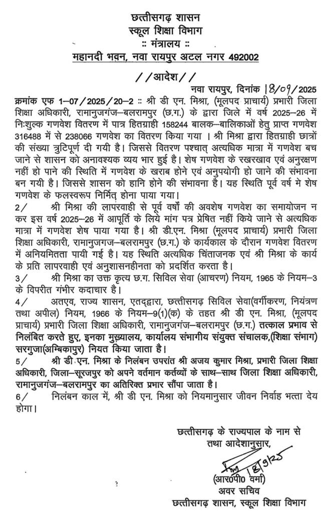 बलरामपुर/(शोएब सिद्दिकी) जिले में वर्ष 2025-26 के लिए निःशुल्क गणवेश वितरण योजना में भारी गड़बड़ी का मामला सामने आया है। प्रभारी जिला शिक्षा अधिकारी श्री डी.एन. मिश्रा (मूल पद प्राचार्य) को शासन ने तत्काल प्रभाव से निलंबित कर दिया है।