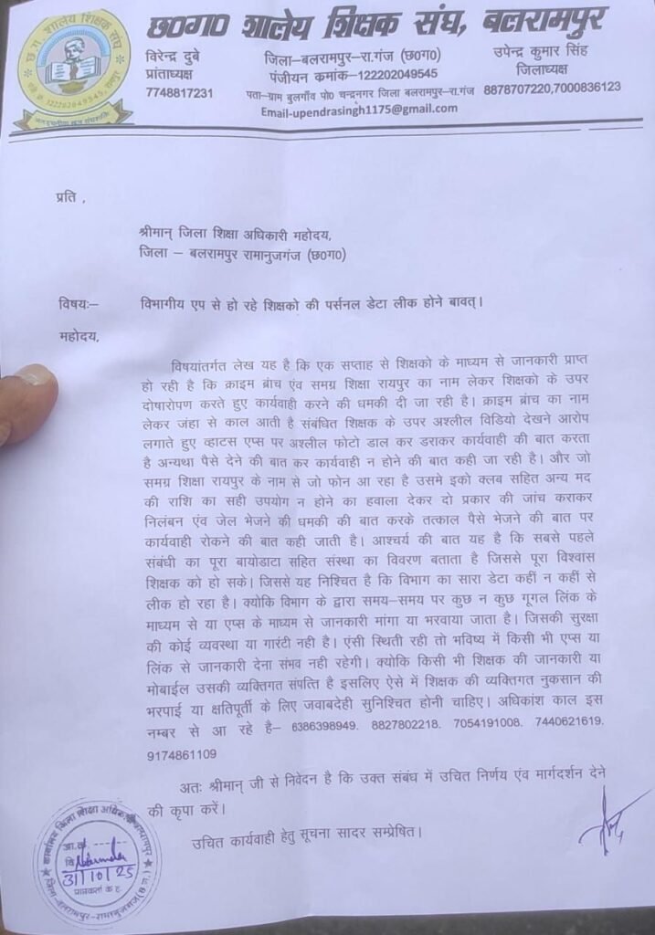 बलरामपुर//(शोएब सिद्दिकी)//शिक्षकों की निजी जानकारी (पर्सनल डाटा) के लीक होने की आशंका को लेकर छत्तीसगढ़ शालेय शिक्षक संघ बलरामपुर ने जिला शिक्षा अधिकारी को ज्ञापन सौंपा है। संगठन ने विभागीय ऐप के माध्यम से शिक्षकों की निजी जानकारी असुरक्षित रूप से लीक होने की संभावना जताई है।