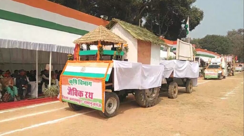 बलरामपुर–रामानुजगंज/(शोएब सिद्दिकी) 26 जनवरी गणतंत्र दिवस के अवसर पर जिला मुख्यालय स्थित पुलिस परेड ग्राउंड में आयोजित भव्य समारोह में कृषि विभाग की झांकी ने सभी का ध्यान अपनी ओर खींचा। “जैविक रथ” के माध्यम से जिले में चल रही प्राकृतिक एवं जैविक खेती की योजनाओं को प्रभावशाली ढंग से प्रस्तुत किया गया।