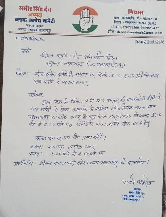 ब्लॉक कांग्रेस कमेटी बलरामपुर के अध्यक्ष समीर सिंह देव ने इस संबंध में अनुविभागीय अधिकारी बलरामपुर को पत्र सौंपकर कार्यक्रम की सूचना दी है। पत्र में उल्लेख किया गया है कि भाजपा सरकार की जनविरोधी नीतियों के कारण किसान धान बिक्री को लेकर परेशान हैं। तकनीकी खामियों, टोकन लिमिट एवं अन्य विसंगतियों से किसान समितियों के चक्कर काटने को मजबूर हैं।