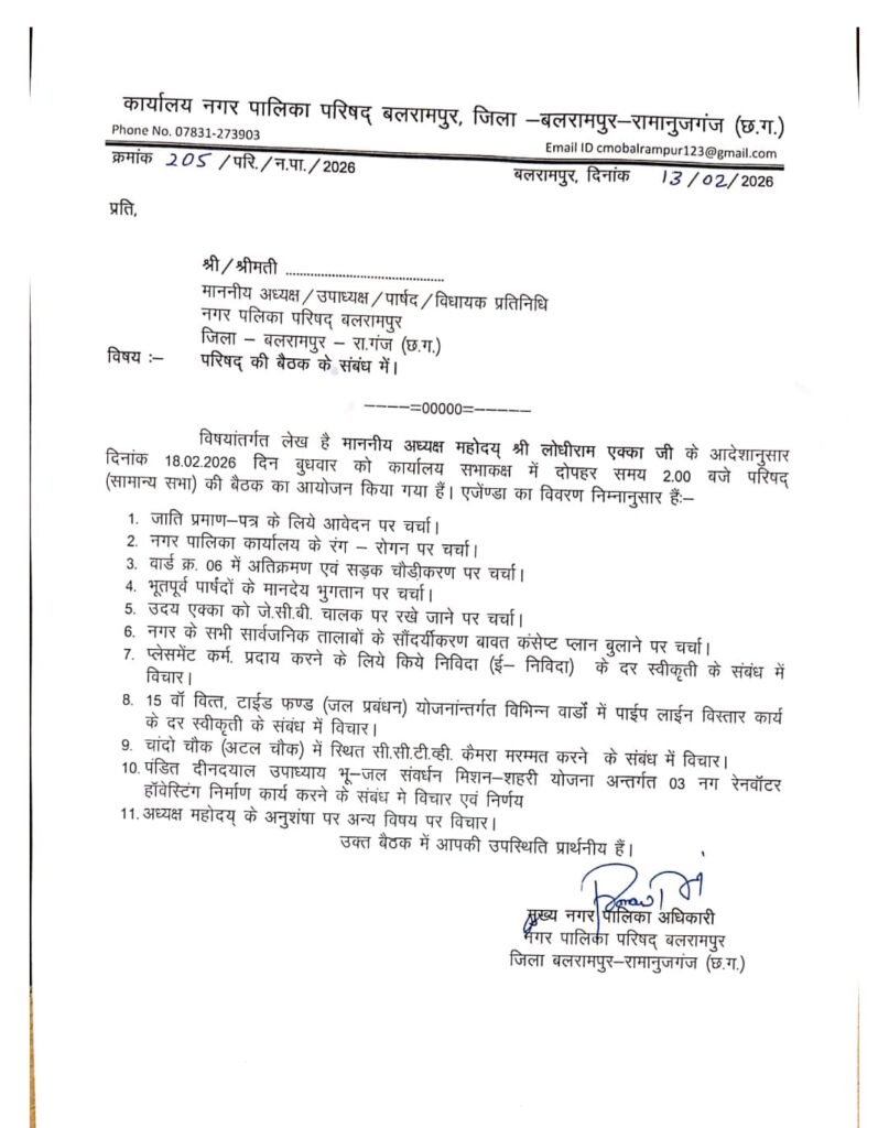 रायपुर/बलरामपुर/(शोएब सिद्दिकी) नगरपालिका परिषद बलरामपुर की प्रस्तावित सामान्य बैठक आज लगातार दूसरी बार निरस्त हो गई, जिससे नगर के विकास कार्यों और जनहित से जुड़े महत्वपूर्ण प्रस्तावों पर निर्णय नहीं हो सका। बैठक निरस्त होने से शहर में चल रही विभिन्न अधोसंरचनात्मक योजनाओं, स्वच्छता व्यवस्था, पेयजल आपूर्ति, सड़क निर्माण एवं अन्य आवश्यक कार्यों पर अनिश्चितता की स्थिति बन गई है। इस घटनाक्रम से आम नागरिकों में निराशा और असंतोष व्याप्त है।