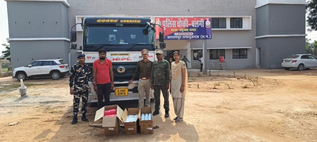 बलरामपुर/रिपोर्ट (आफताब आलम) पुलिस अधीक्षक बलरामपुर डॉ. लाल उमेद सिंह (भा.पु.से) के सतत् मार्गदर्शन में जिले में अवैध पदार्थों के परिवहन पर अकुंश लगाने हेतु जिले के समस्त थाना / चौकी प्रभारियों को निर्देशित किया गया है, तथा विधानसभा चुनाव 2023 के दृष्टिगत बार्डर नाका प्वाइंट पर नाकाबंदी लगाकर आने-जाने वाले वाहनों की 24 घंटे लगातार चेकिंग की जा रही है। इसी कड़ी में 11नवंबर.2023 की दरम्यानी रात्रि मध्यप्रदेश छत्तीसगढ़ बार्डर में स्थित ग्राम तुगवां चेक पोस्ट में चौकी प्रभारी बलंगी हमराह स्टाफ एवं एसएसटी व जीएसटी टीम के साथ वाहन चेकिंग के दौरान मध्यप्रदेश की ओर से आ रहे भारत बेंज ट्रक वाहन क्रमांक RJ 06 GD 2810 को चेक करने हेतु रोका गया, वाहन चालक एवं परिचालक से नाम पता पुछने पर वाहन चालक अपना नाम पता सुरेश चंद चौधरी पिता शंकर लाल जाट उम्र 28 साल सा० किरापुरा वार्ड क्रमांक 01 थाना-पुर जिला भीलवाड़ा राजस्थान एवं परिचालक अपना नाम पता राजकुमार सेन पिता गिरधारी लाल सेन जाति नाई उम्र 25 साल सा० सुलखनीया थाना परीहारा जिला चुरू राजस्थान बताया।