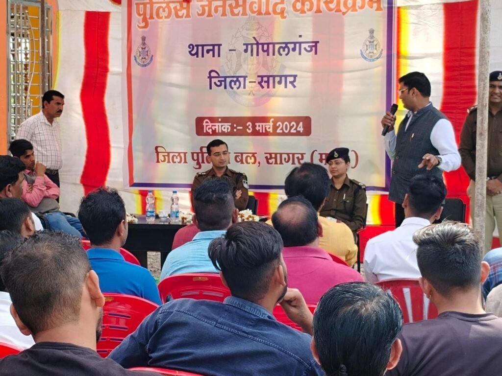 सागर/स्टेट हेड (अनिल तिवारी) मध्यप्रदेश के सागर जिले के समस्त थानाक्षेत्रों में पुलिस जनसंबाद कार्यक्रम आयोजित किये गये, जिसमें जनता एवं पुलिस के बीच की दूरी को कम किया जा सके, पुलिस एवं जनता एक दूसरे के सहायक हो।