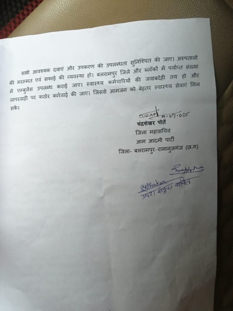 आज दिनांक 1/07/2025 दिन मंगलवार को छत्तीसगढ़ में बदहाल स्वास्थ्य व्यवस्था को लेकर मुख्यमंत्री के नाम अपर कलेक्टर महोदय को ज्ञापन सौंपा गया जिसमें प्रदेश संयुक्त सचिव नीलम ठाकुर जी, बलरामपुर जिला इकाई के कार्यालयीन जिला महासचिव चन्द्रशेखर पोर्ते जी, ओर सक्रिय साथी सुग्रीव राम जी उपस्थित रहे।