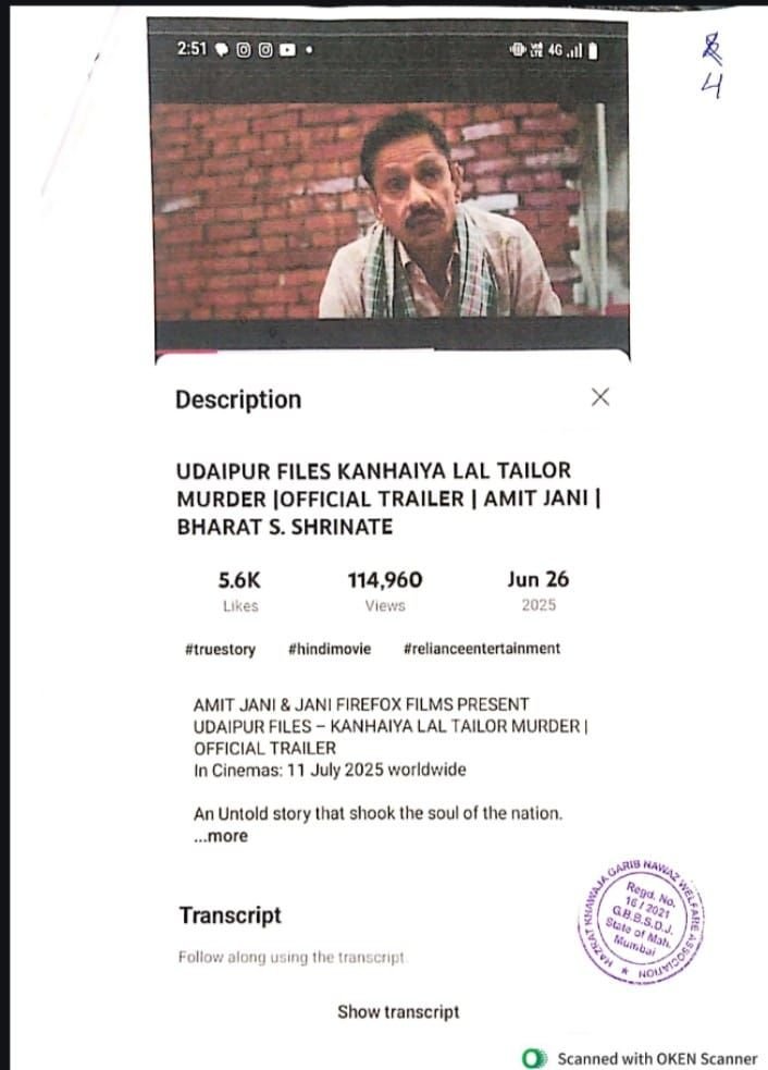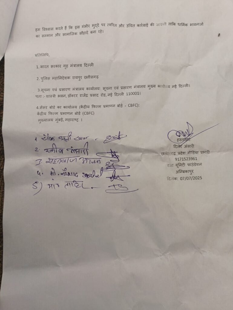 रजा यूनिटी फाउंडेशन के प्रदेश मीडिया प्रभारी, श्री दिलेर अंसारी ने कहा, “यह फिल्म मुस्लिम समुदाय की धार्मिक भावनाओं को गंभीर रूप से आहत करती है और समाज में वैमनस्य व विभाजन को बढ़ावा देती है। ऐसी फिल्में सामाजिक सौहार्द और राष्ट्रीय एकता के लिए खतरा हैं। हम मांग करते हैं कि इस फिल्म के प्रदर्शन पर तत्काल रोक लगाई जाए।