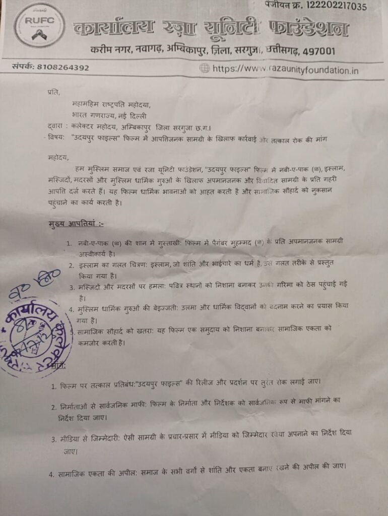 “इसी संदर्भ में, जिला कलेक्टर, सरगुजा, अंबिकापुर के माध्यम से महामहिम राष्ट्रपति, भारत गणराज्य को एक ज्ञापन सौंपा गया है, जिसमें “उदयपुर फाइल्स” फिल्म पर तत्काल रोक लगाने की मांग की गई है। प्रशासन ने इस मामले में उचित कार्रवाई का आश्वासन दिया है।